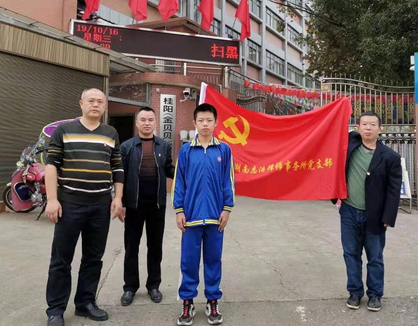 2019年10月16日上午,湖南志浩律师事务所党员雷苍柏、颜世兵在支部书记刘文忠的带领下,来到桂阳县铭郡学校,对贫困学生尹骏豪送来爱心款2000元。
